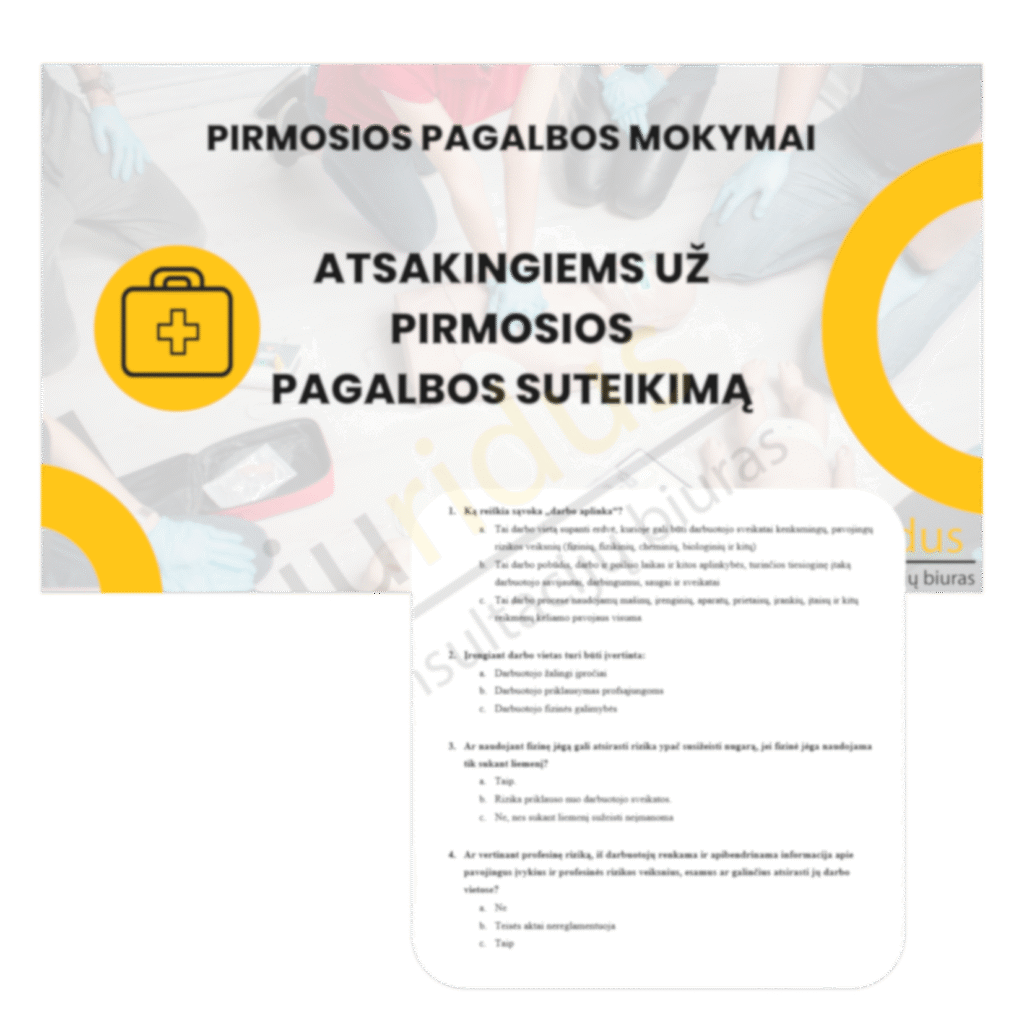 Dėmesio: Pirmosios pagalbos kursą sudaro savarankiško pasiruošimo dalis ir praktinė dalis, į kurią būtina atvykti. Pažymėjimai išduodami tik išlaikius kurso teorinį testą ir atlikus praktinę užduotį gyvai.