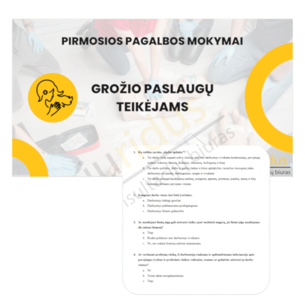 Dėmesio: Pirmosios pagalbos kursą sudaro savarankiško pasiruošimo dalis ir praktinė dalis, į kurią būtina atvykti. Pažymėjimai išduodami tik išlaikius kurso teorinį testą ir atlikus praktinę užduotį gyvai.