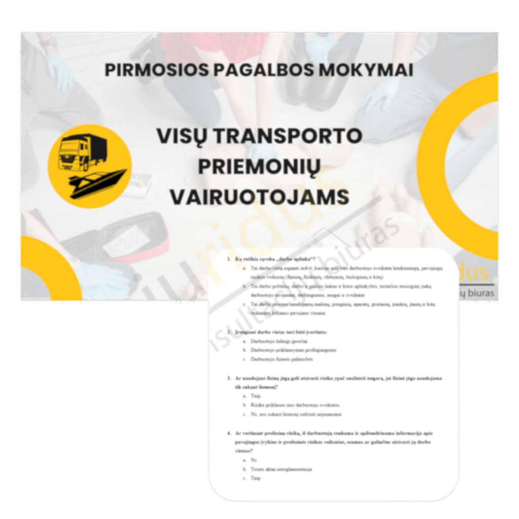 Dėmesio: Pirmosios pagalbos kursą sudaro savarankiško pasiruošimo dalis ir praktinė dalis, į kurią būtina atvykti. Pažymėjimai išduodami tik išlaikius kurso teorinį testą ir atlikus praktinę užduotį gyvai.