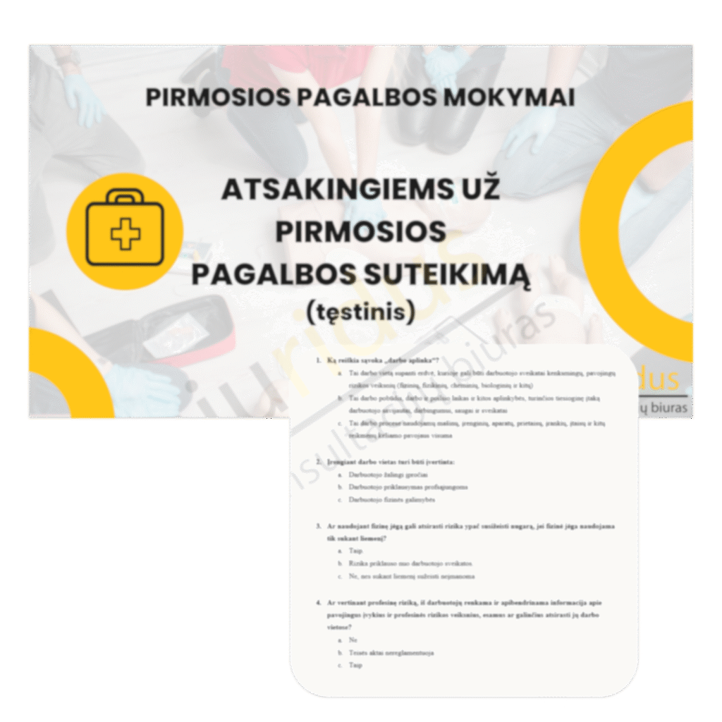 Dėmesio: Pirmosios pagalbos kursą sudaro savarankiško pasiruošimo dalis ir praktinė dalis, į kurią būtina atvykti. Pažymėjimai išduodami tik išlaikius kurso teorinį testą ir atlikus praktinę užduotį gyvai.