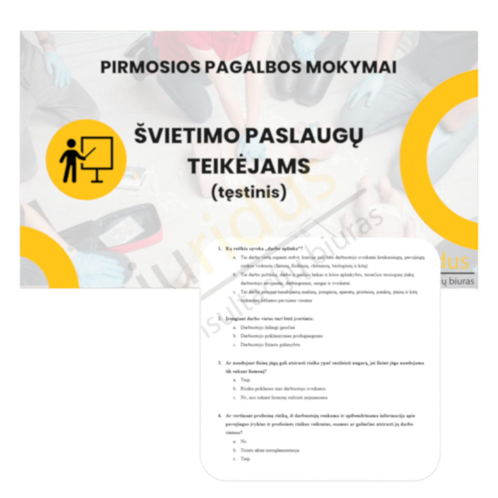 Dėmesio: Pirmosios pagalbos kursą sudaro savarankiško pasiruošimo dalis ir praktinė dalis, į kurią būtina atvykti. Pažymėjimai išduodami tik išlaikius kurso teorinį testą ir atlikus praktinę užduotį gyvai.